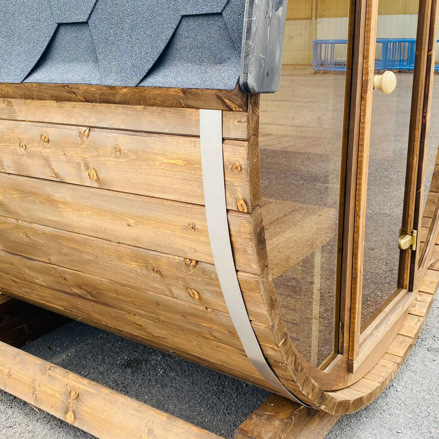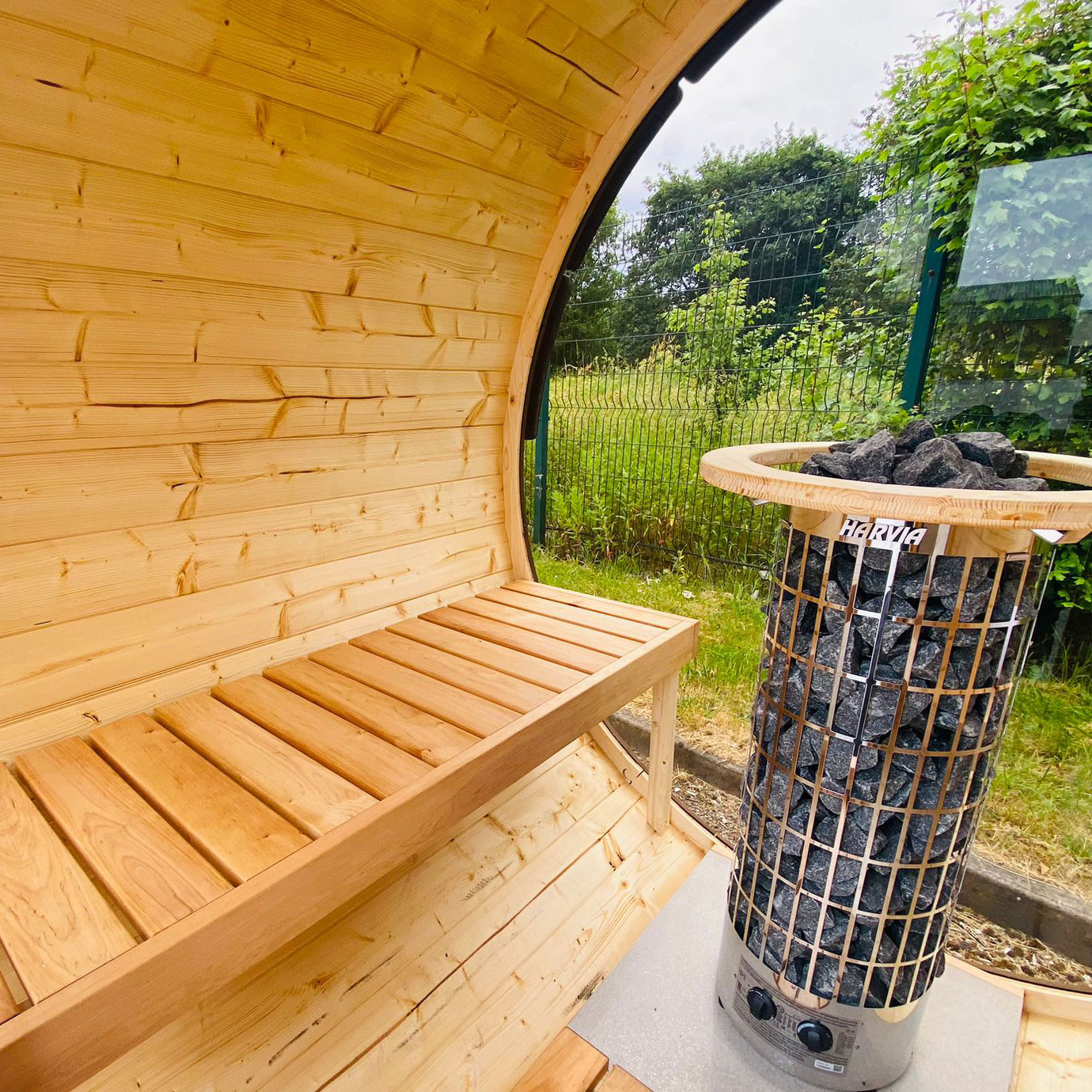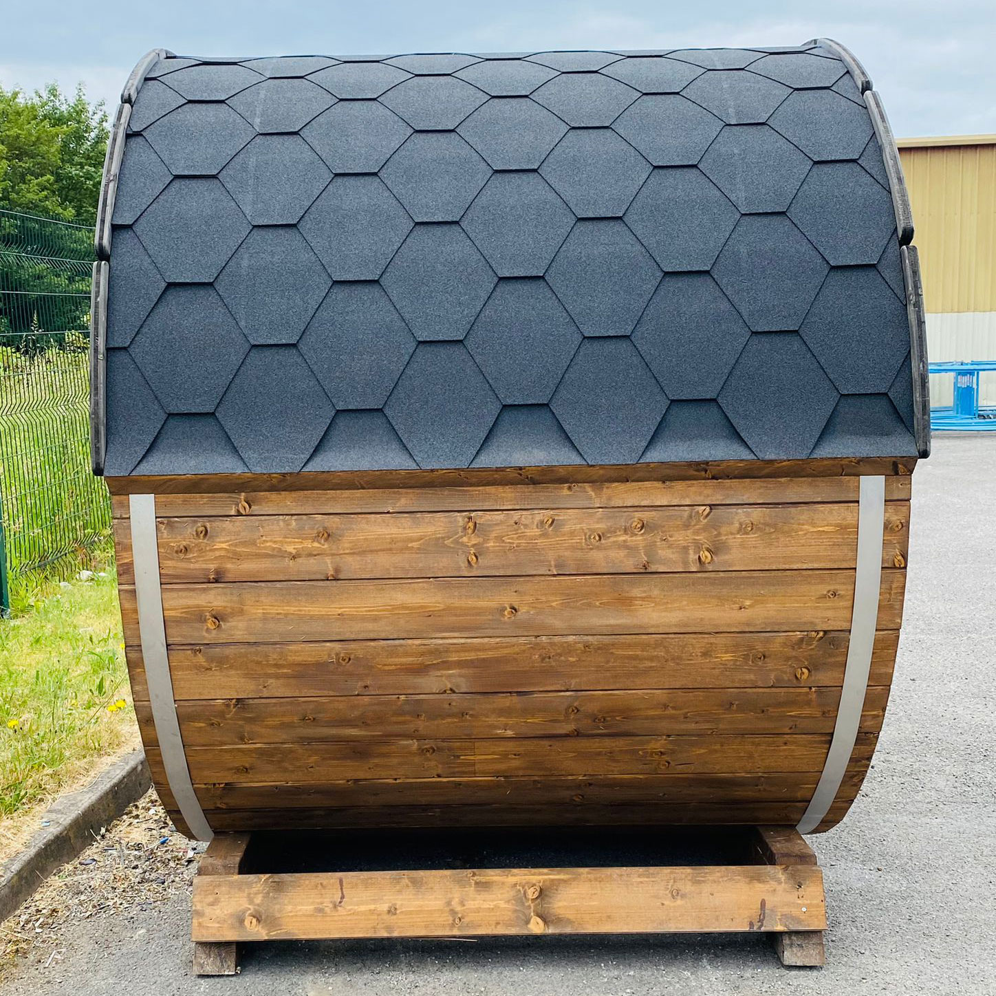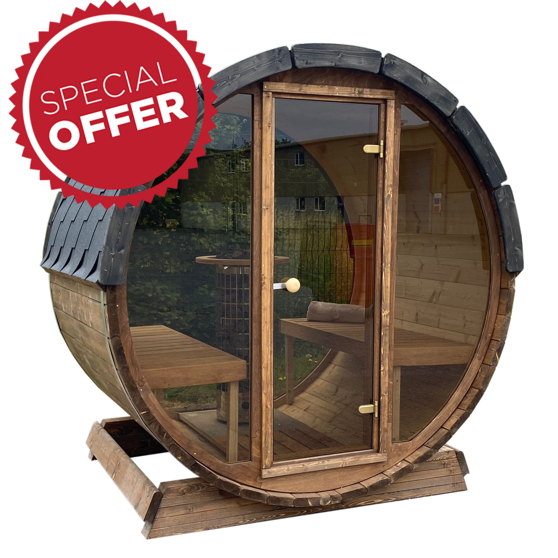The Deluxe Terrace Sauna features a full front toughened glass panoramic window and door. Alder benches complement the spacious interior and the roof is covered in black ketpal sheet. Finished in Woodland Red timber colour, the Deluxe Terrace Sauna also features a FREE upgraded bronze safety glass panoramic rear wall, and includes pre-wired Harvia Cilindro PC66 electric heater with matching sauna stones!