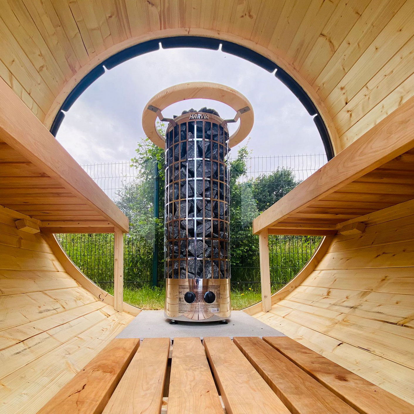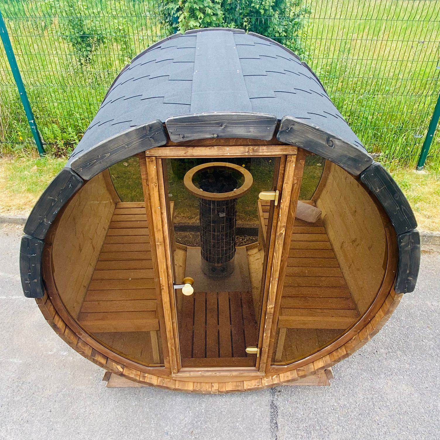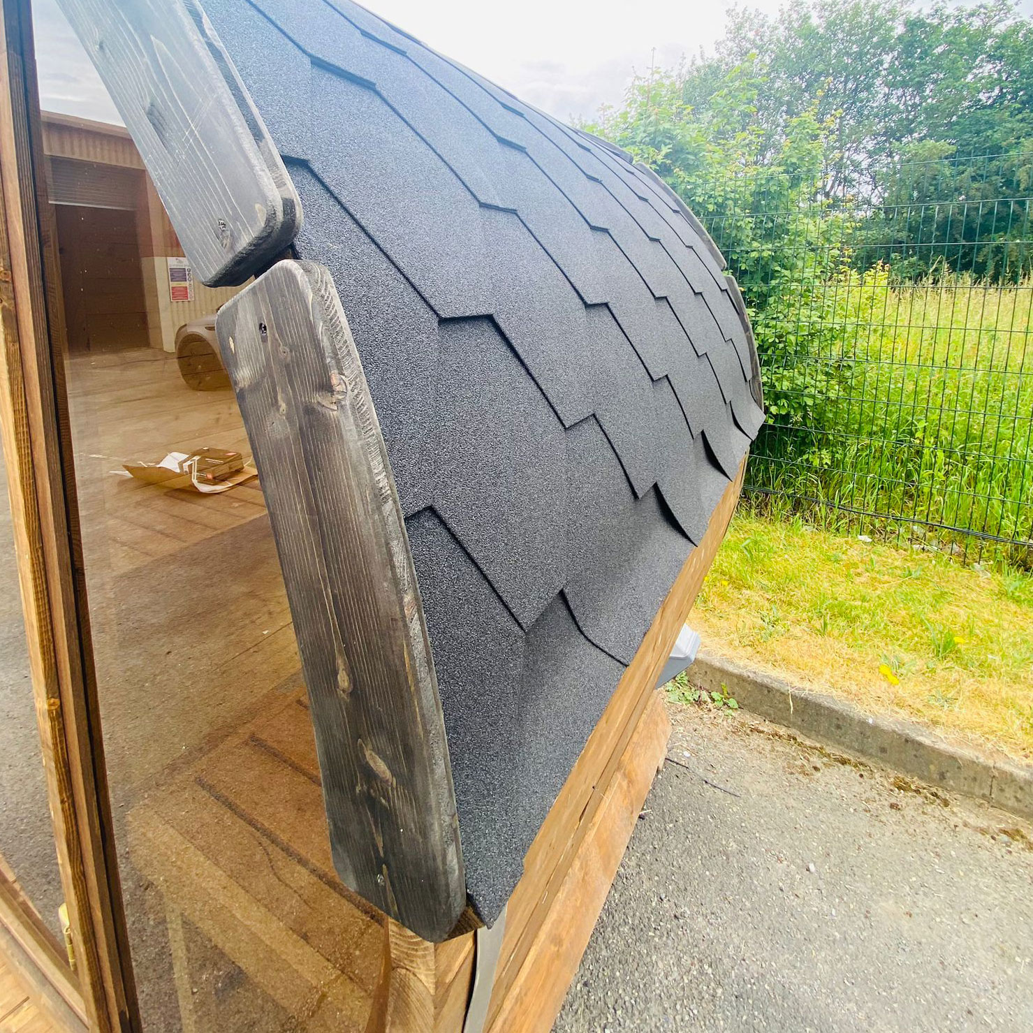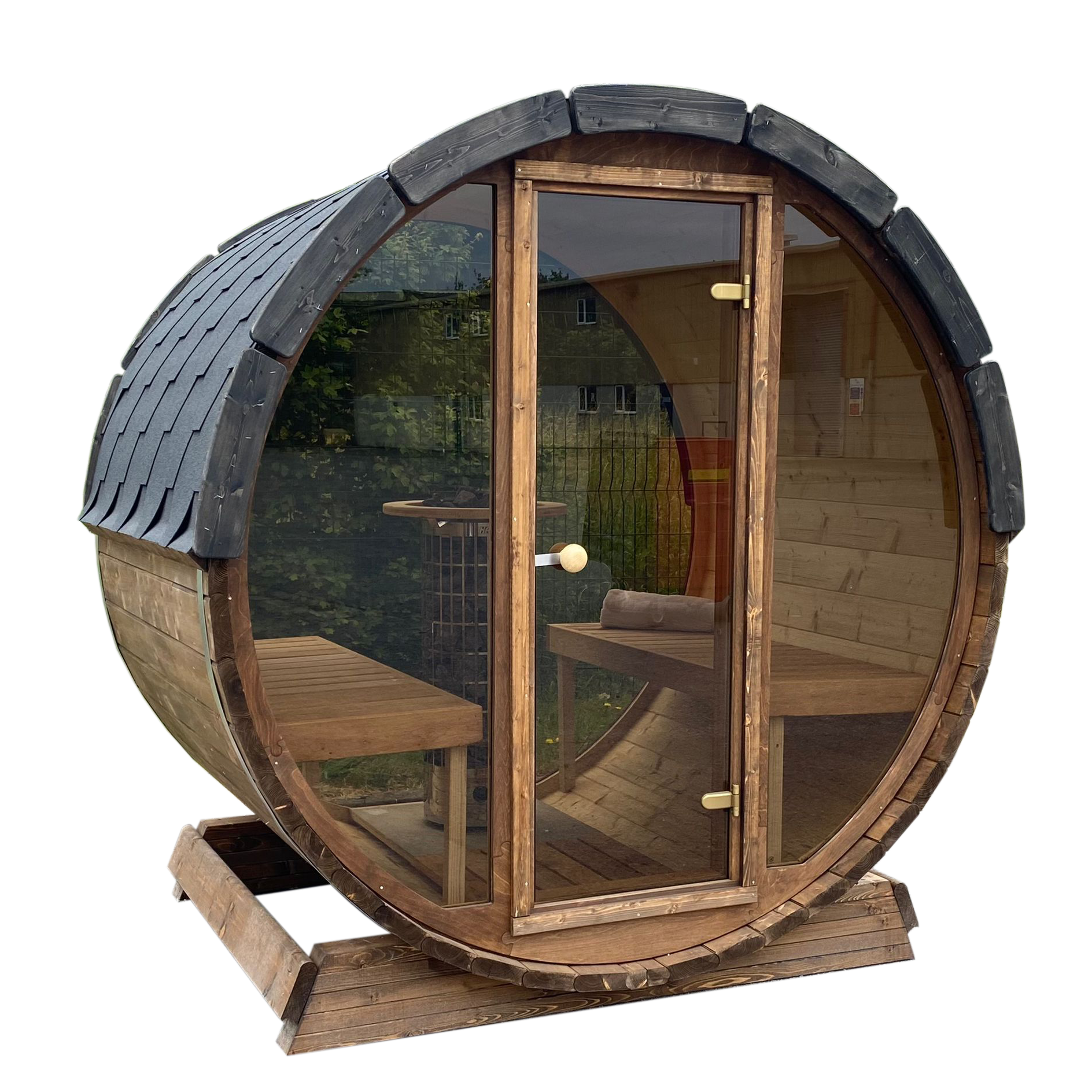 The Deluxe Terrace Sauna features a full front toughened glass panoramic window and door. Alder benches complement the spacious interior and the roof is covered in black ketpal sheet. Finished in Woodland Red timber colour, the Deluxe Terrace Sauna also features a FREE upgraded bronze safety glass panoramic rear wall, and includes pre-wired Harvia Cilindro PC66 electric heater with matching sauna stones!