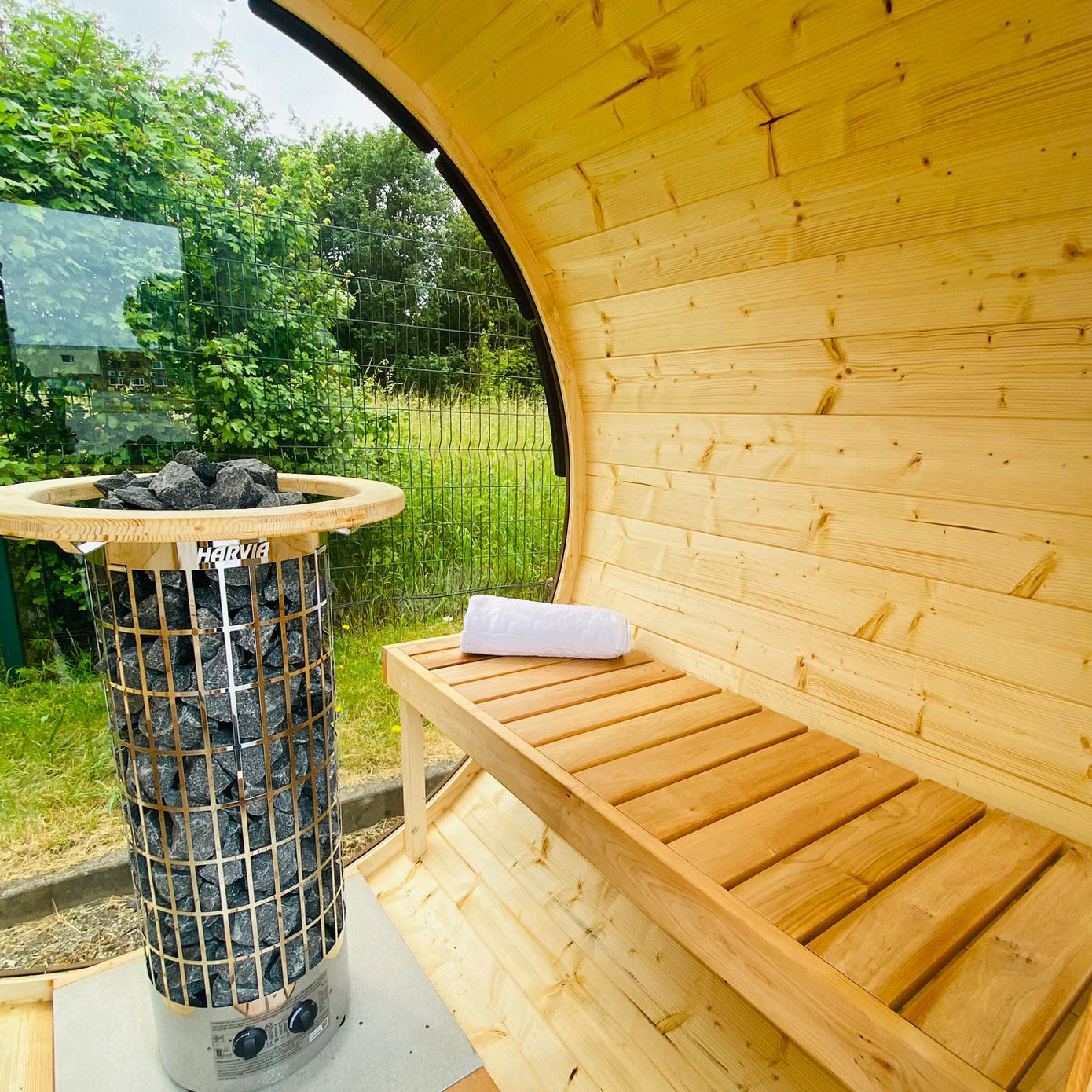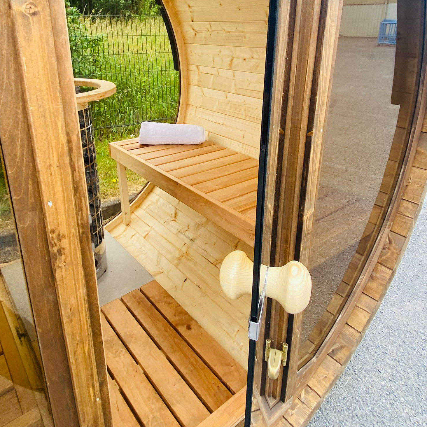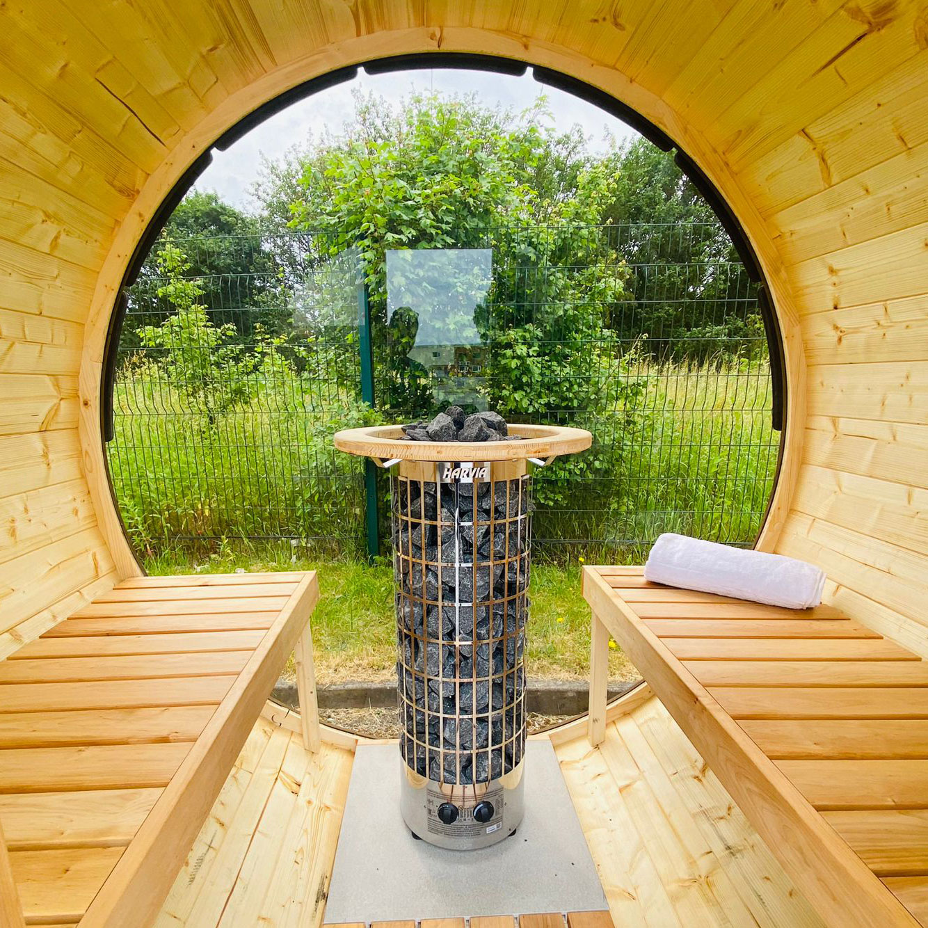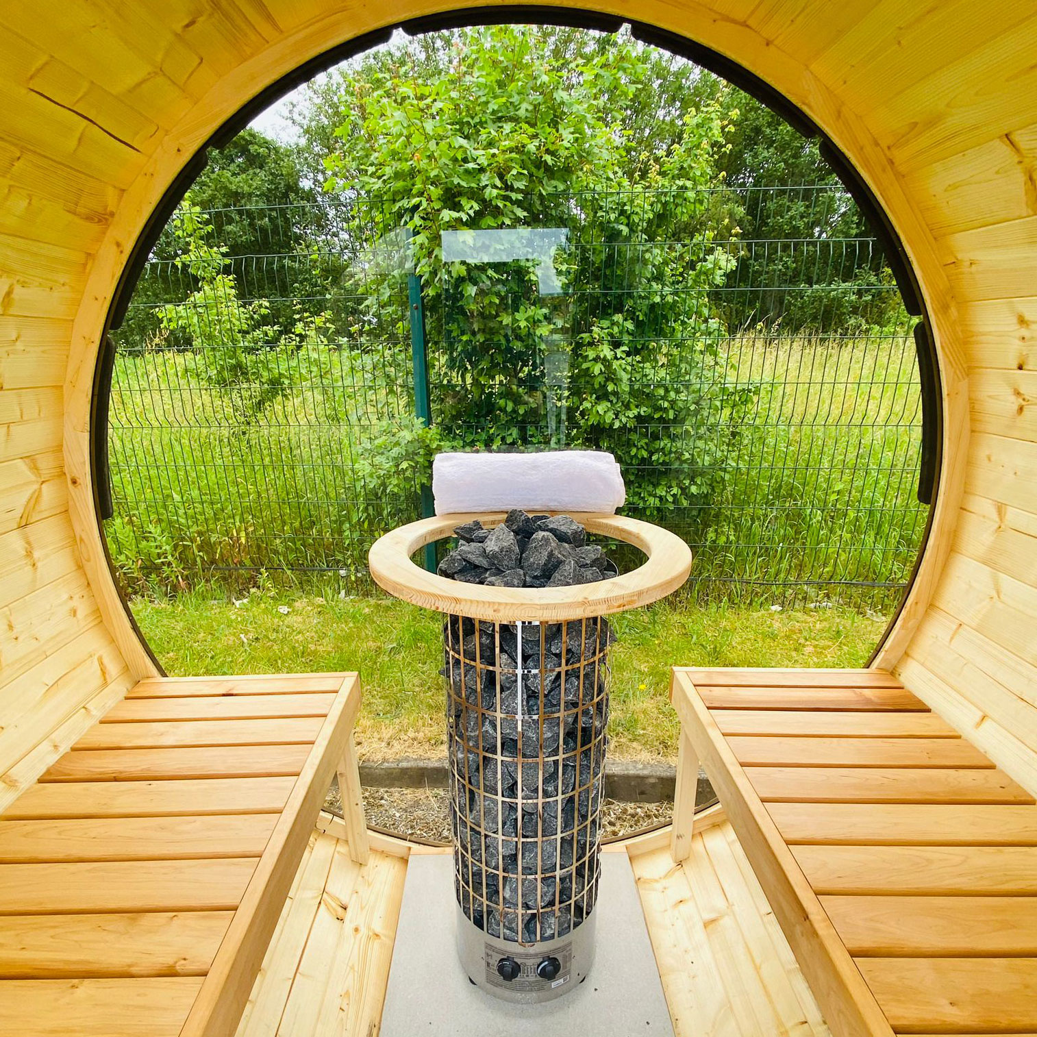 The Deluxe Terrace Sauna features a full front toughened glass panoramic window and door. Alder benches complement the spacious interior and the roof is covered in black ketpal sheet. Finished in Woodland Red timber colour, the Deluxe Terrace Sauna also features a FREE upgraded bronze safety glass panoramic rear wall, and includes pre-wired Harvia Cilindro PC66 electric heater with matching sauna stones!